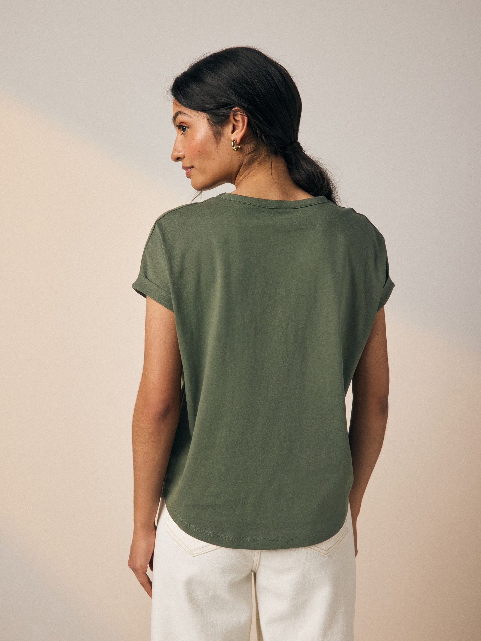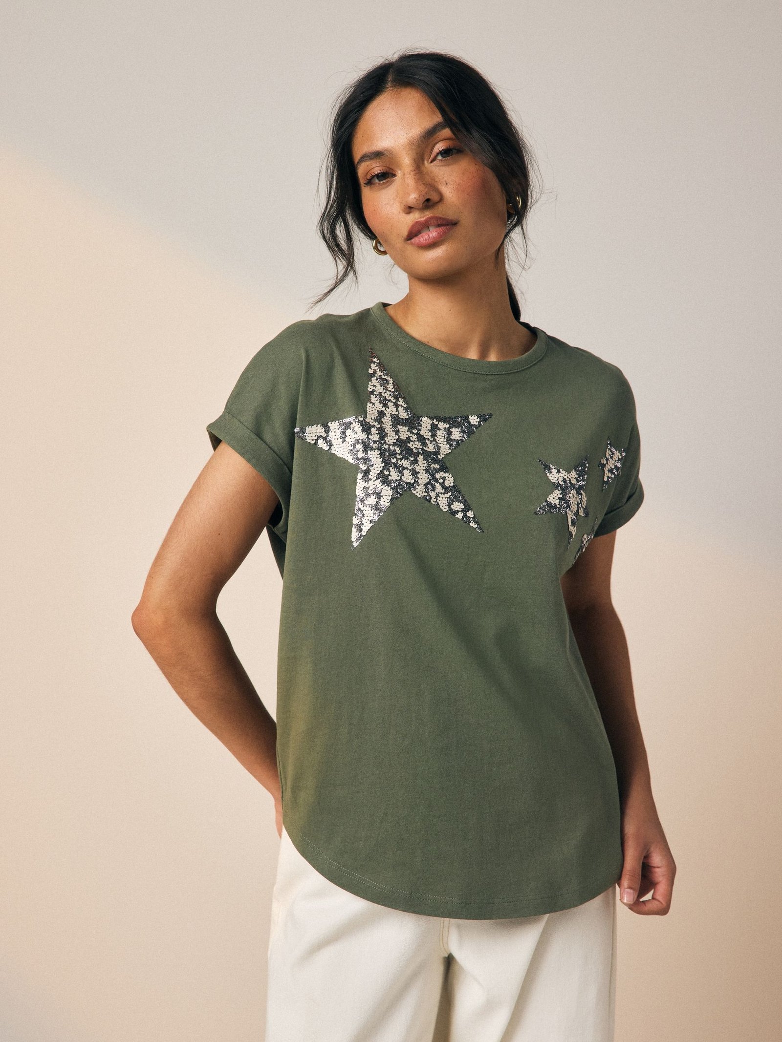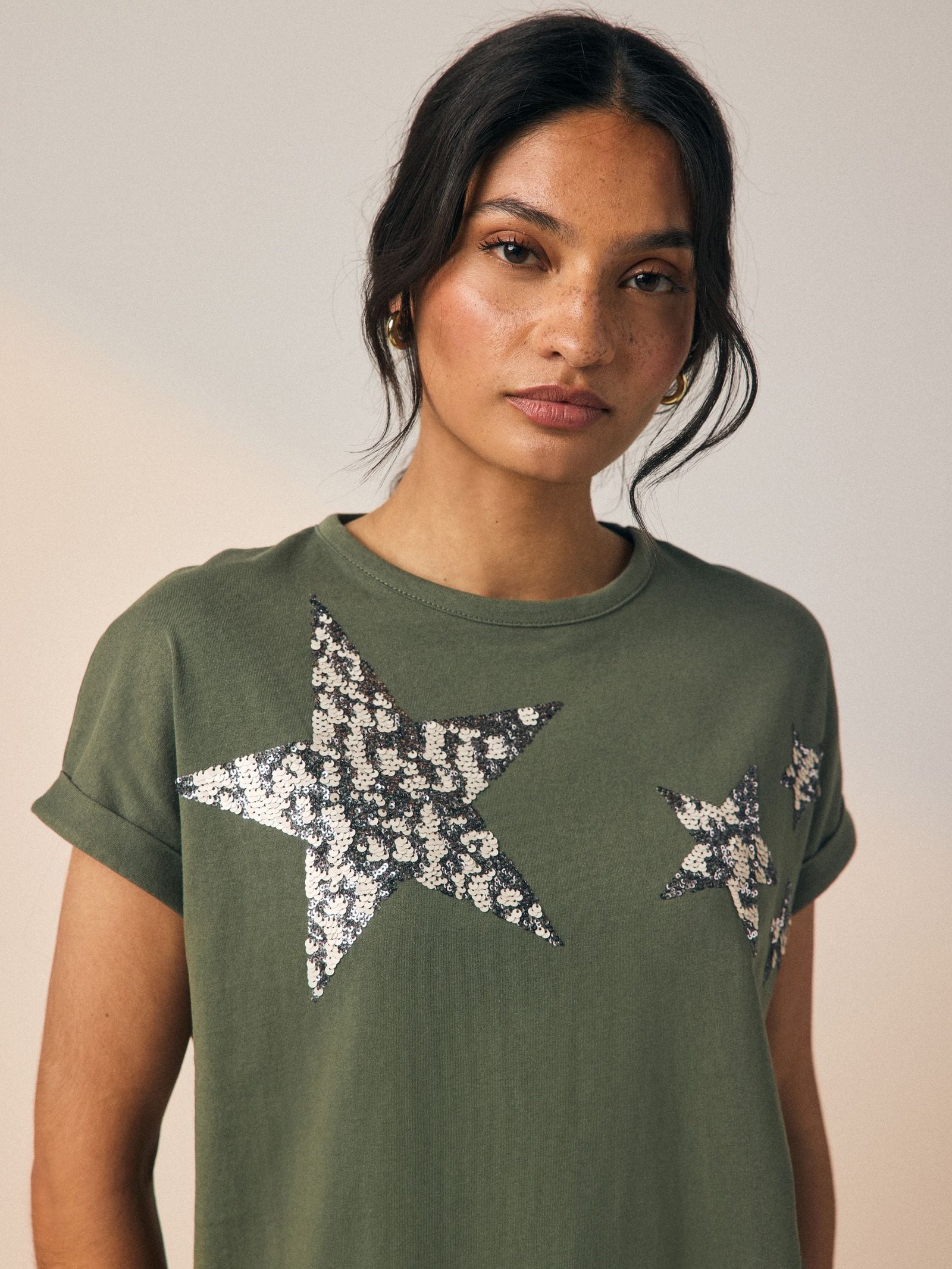 Add some sparkle to your rotation with our sparkle sequin star top. Made from pure cotton, this khaki green regular-fit t-shirt is coated in a fun star design, complete with short sleeves and a crew neckline.100% cottonSequin star detailRegular fit